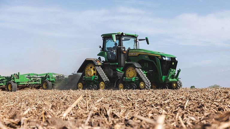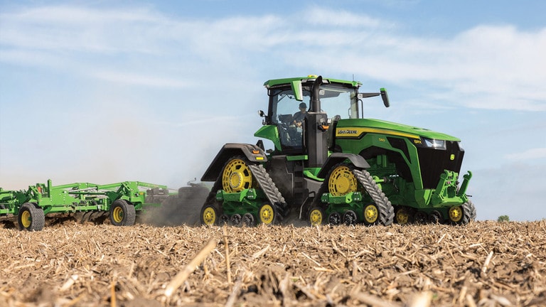 Jedinečné čtyřpásové traktory řady 8RX s vysokým výkonem nabízejí špičkovou trakci a maximální ochranu půdy: Díky pásům o šířce až 30", širším napínacím kolům pro zadní 30" pásy a nové konstrukci záběrových zubů stanovuje model 8RX nový standard v ochraně půdy. Pokročilý design podvozku, nyní s hnacími výstupky Pokročilá konstrukce podvozku – nově s hnacími výstupky a záběrovými zuby vylisovanými přímo na pásu – spolu s novými pojezdovými koly z materiálu UHMW (s ultra vysokou molekulovou hmotností) z odolného železo-polymer-pryžového kompozitu s trvalým spojením zajišťuje bezkonkurenční výkon a spolehlivost i v těch nejnáročnějších podmínkách..
