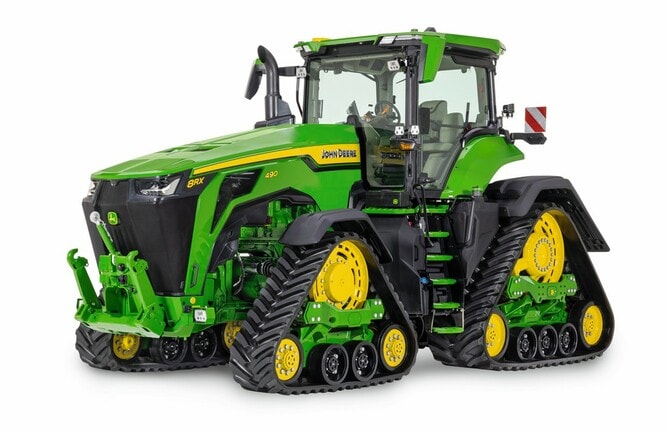 Jedinečné čtyřpásové traktory řady 8RX s vysokým výkonem nabízejí špičkovou trakci a maximální ochranu půdy: Díky pásům o šířce až 30", širším napínacím kolům pro zadní 30" pásy a nové konstrukci záběrových zubů stanovuje model 8RX nový standard v ochraně půdy. Pokročilý design podvozku, nyní s hnacími výstupky Pokročilá konstrukce podvozku – nově s hnacími výstupky a záběrovými zuby vylisovanými přímo na pásu – spolu s novými pojezdovými koly z materiálu UHMW (s ultra vysokou molekulovou hmotností) z odolného železo-polymer-pryžového kompozitu s trvalým spojením zajišťuje bezkonkurenční výkon a spolehlivost i v těch nejnáročnějších podmínkách..